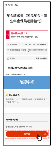 - 再申請が必要です(要再申請):届書を審査した結果、申請内容を修正いただく必要がある場合に表示されます。詳細は、マイナポータルのお知らせに記載していますので内容をご確認のうえ、あらためてお手続きください。