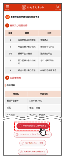 選択した届書の申請内容が表示されます。画面を下までスクロールし、「申請内容を修正し再申請する」を押すと、届書の申請画面に移ります。