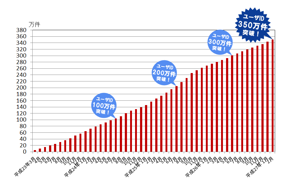 平成23年2月のサービス開始からおよそ4年。平成27年2月に「ねんきんネット」のユーザID発行件数が、おかげさまで350万件を突破しました。