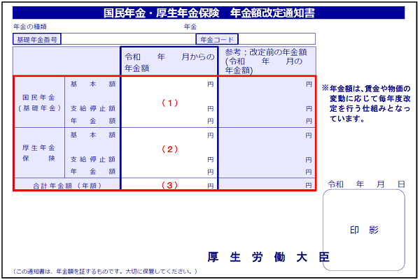The pension amount is revised each fiscal year according to changes in wages and prices, as stipulated by law. If your pension amount is revised, you will receive "Notice of Pension Amount Change." (shown below.)