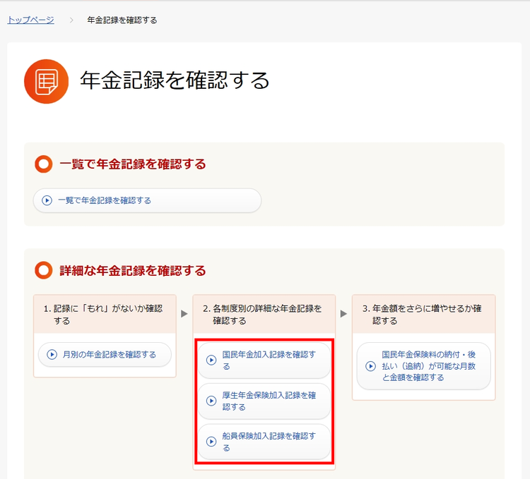 - 「詳細な年金記録を確認する」内の「国民年金加入記録を確認する」、「厚生年金保険加入記録を確認する」、「船員保険加入記録を確認する」ボタンをクリックすると、年金制度ごとの記録を確認できます。