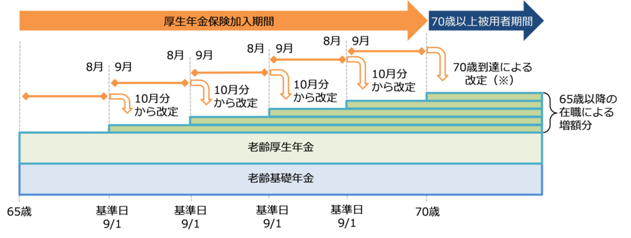 在職定時改定とは、毎年、基準日(9月1日)に厚生年金保険に加入中の65歳以上70歳未満の老齢厚生年金の受給権者について、前年9月から当年8月までの厚生年金保険加入期間を反映して、年金額を毎年10月分(12月受取分)から改定する仕組みです。