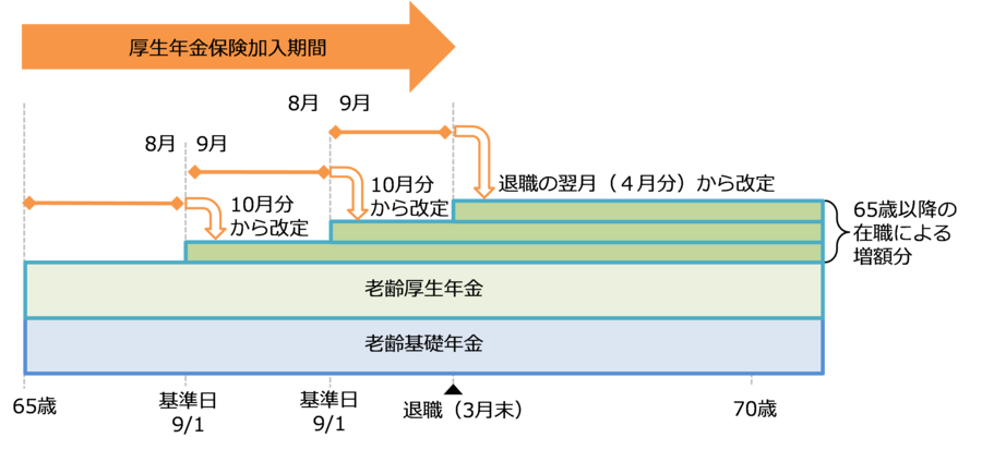 老齢年金の受給権発生後も70歳まで厚生年金保険に加入することができます。厚生年金保険に加入した期間は、在職定時改定・退職改定により年金額の計算の基礎となる被保険者期間に追加され、受け取る年金額が増えます。