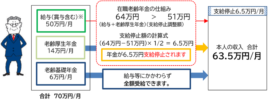 Bさんの場合、給与と老齢厚生年金の合計が1月あたり64万円で、支給停止調整額の51万円を13万円超えています。