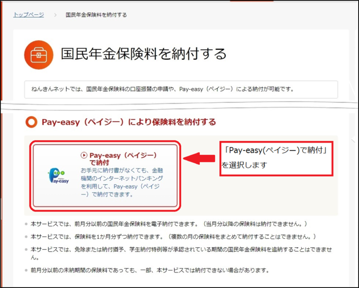 (2)「国民年金保険料を納付する」画面の「Pay-easy(ペイジー)で納付」を選択します。