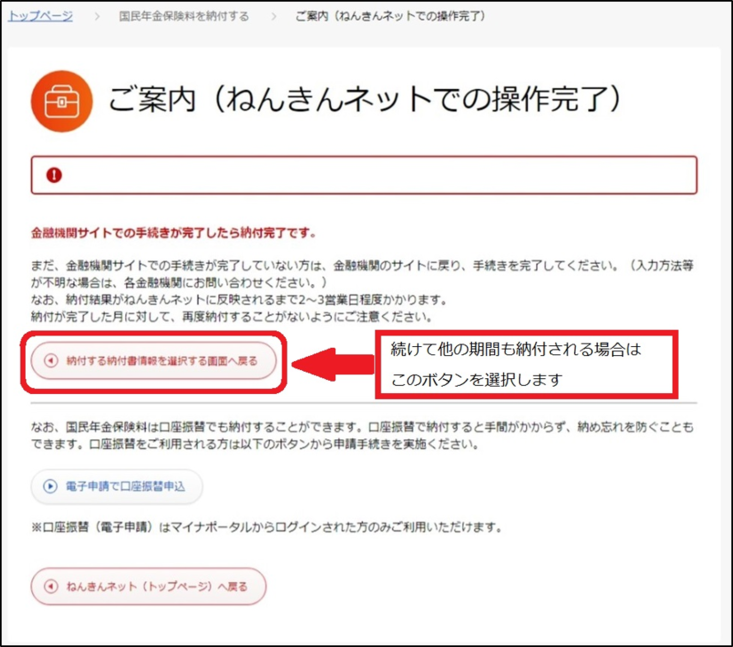 続けて他の期間も納付される場合は、ねんきんネット画面に戻り、「納付する納付書情報を選択する画面へ戻る」を選択し、納付したい年度、月(納付書情報)を選択してください。