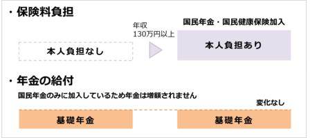 年収が130万円以上になると、配偶者の扶養からはずれ、保険料負担(国民年金・国民健康保険)が新たに発生するものの、保障内容に変化はありません。週の所定労働時間が20時間以上等の条件を満たした場合は、厚生年金保険・健康保険に加入し、保険料負担(厚生年金保険・健康保険)(労使折半)が新たに発生するものの、その分保障も充実します。